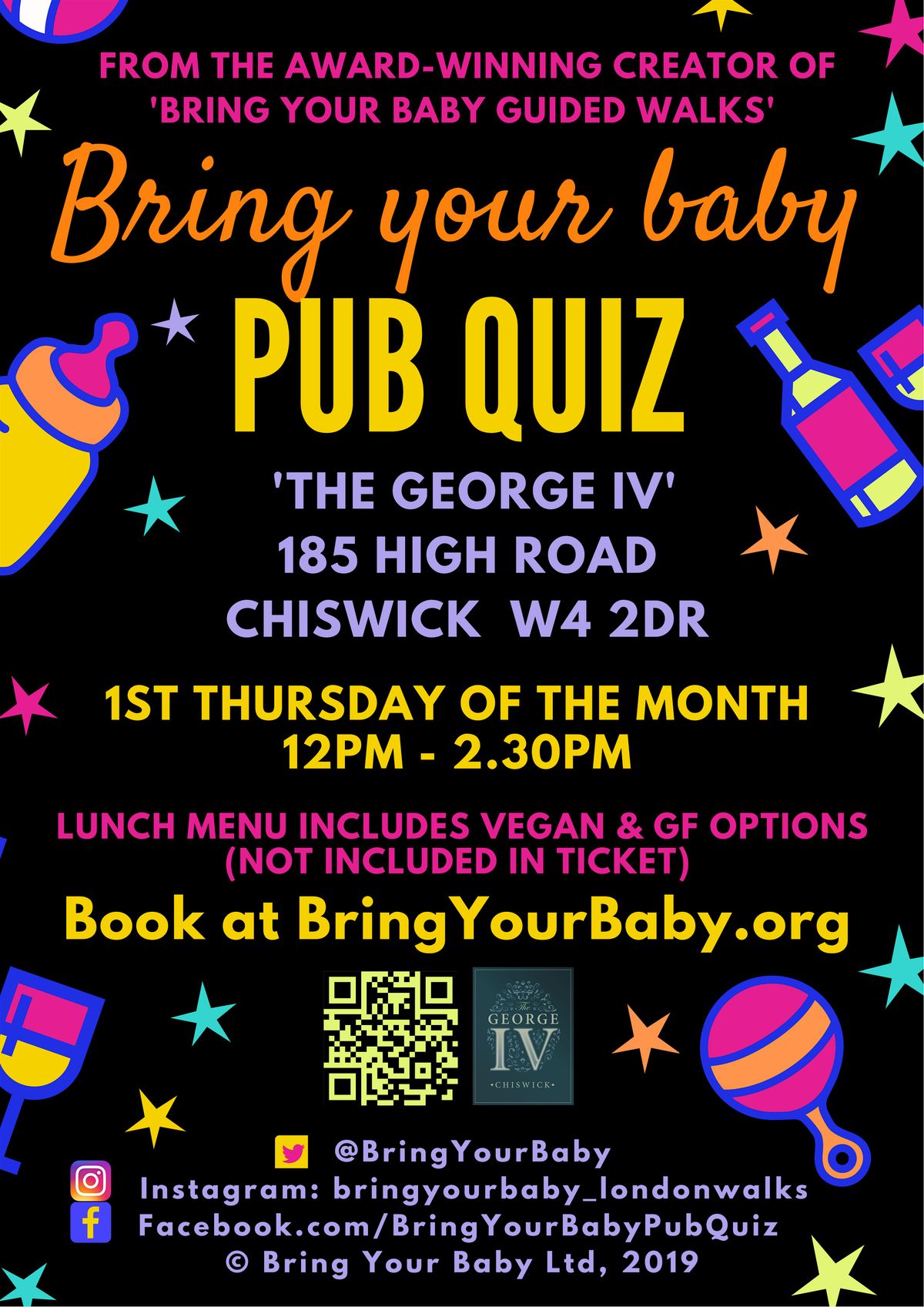 From the award-winning creator of ‘Bring Your Baby Guided London Walks’, ‘Bring Your Baby Pub Quizzes’ are fun, brain-stimulating daytime parent socials, which take place all over London. In GREAT pubs.