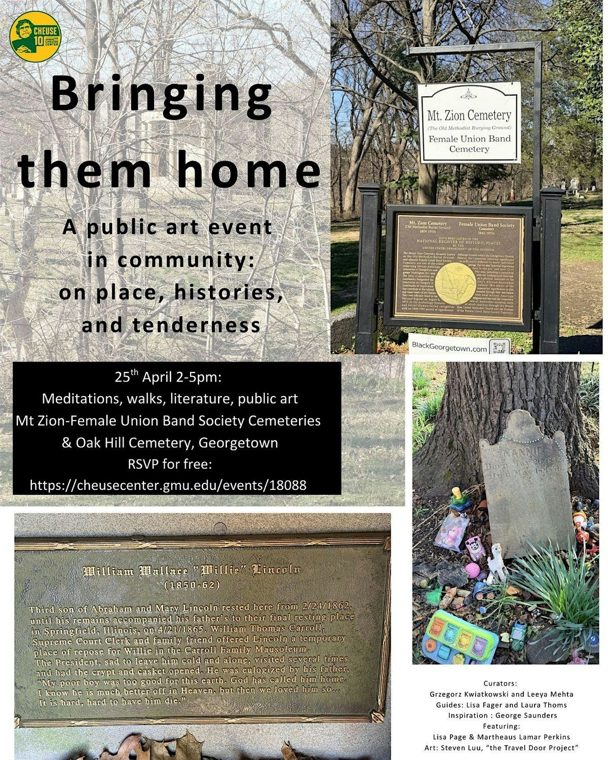 An afternoon exploring place and history, featuring Polish writer and activist Grzegorz Kwiatkowski, alongside Mt Zion- Female Union Band Society Cemetery’s Director Lisa Fager, Oak Hill Cemetery’s Archivist and Collections Manager Laura Thoms, Director of GW’s Creative Writing program Lisa Page, poet Martheaus Perkins, and writer and Cheuse Director Leeya Mehta, with guided tours connecting literature, history, and place. As we visit these cemeteries we also acknowledge that many of us will never be found, never be buried, never be known perhaps; so how do we create the idea of home and last rites, how do we continue to form community across the world even when there is no closure? How do we carry history, and bring the lessons home? Inspiration comes from George Saunders and James Baldwin and the places we come from, the places we live in, and the places we are going.