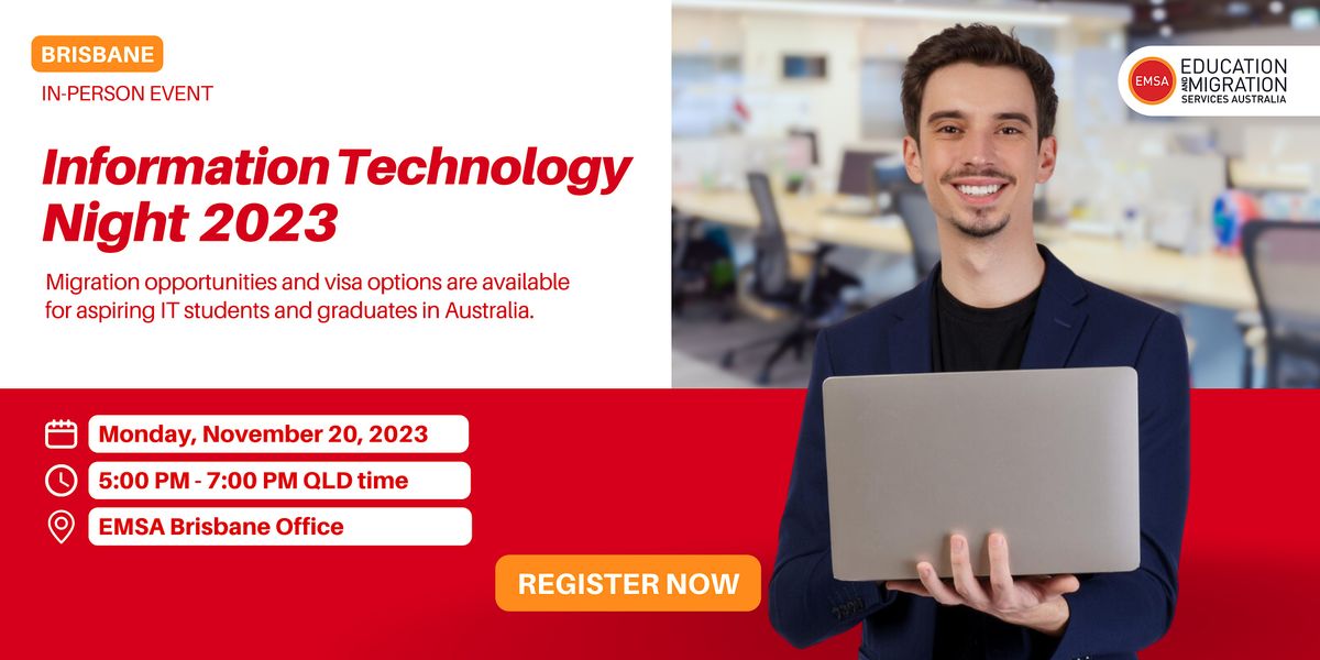 Discover exciting opportunities in Information Technology (IT) at our upcoming event. Join us on Monday, November 20, 2023, at the EMSA Brisbane Office for an enriching and informative evening. This event has been carefully designed to provide international students like you, who are eager to learn more about the IT industry, with insights into exciting career prospects and the secrets to thriving in this exhilarating field.