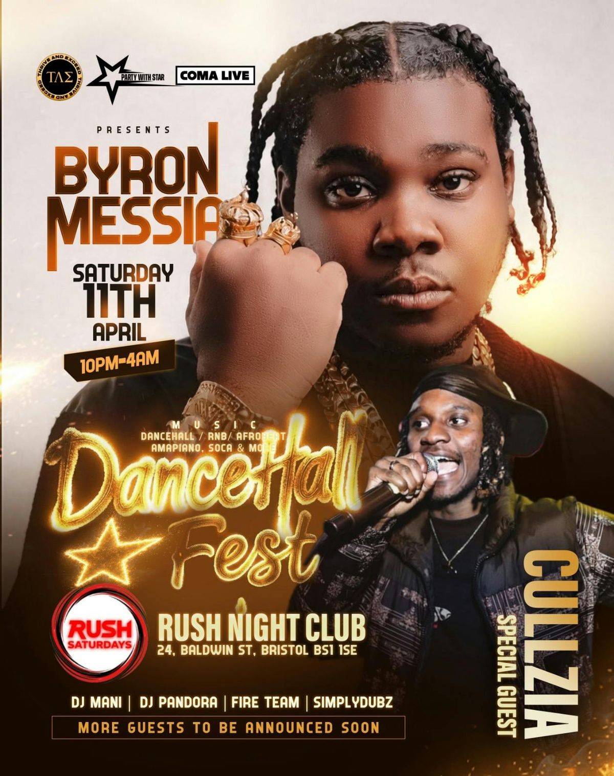 🔥🔥 DANCEHALL FEST HITTING BRISTOL 🔥🔥We’re bringing dancehall superstar Byron Messia performing LIVE 🔥🤯The vibes. The energy. The litness. The performance.It’s about to be on a whole next level as he joins us on his UK tour ‼️⭐️🗓️ Saturday 11th April⏰ 10PM – 4AM📍 Rush Nightclub, Bristol🎶 R&B | Hip Hop | Dancehall | Reggae | AfrobeatsPerforming all the bangers live:Taliban, Choppa, Smallest Circle, 90z + more 🔥🎧 Music by: Fireteam, DJ Supavibez, DJ Mani, DJ Pandora, DJ SimplyDub • More to be announced🥂 Table packages available – DM us to book.🎟️ Tickets available now