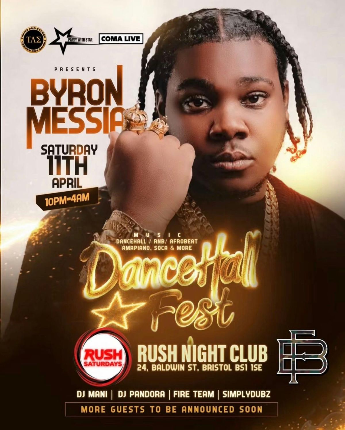 🔥🔥 DANCEHALL FEST HITTING BRISTOL 🔥🔥We’re bringing dancehall superstar Byron Messia performing LIVE 🔥🤯The vibes. The energy. The litness. The performance.It’s about to be on a whole next level as he joins us on his UK tour ‼️⭐️🗓️ Saturday 11th April⏰ 10PM – 4AM📍 Rush Nightclub, Bristol🎶 R&B | Hip Hop | Dancehall | Reggae | AfrobeatsPerforming all the bangers live:Taliban, Choppa, Smallest Circle, 90z + more 🔥🎧 Music by: Fireteam, DJ Supavibez, DJ Mani, DJ Pandora, DJ SimplyDub • More to be announcedFlyboy clothing will be doing give aways on the night as they sponsor Byron MESSIA🥂 Table packages available – DM us to book.🎟️ Tickets available now
