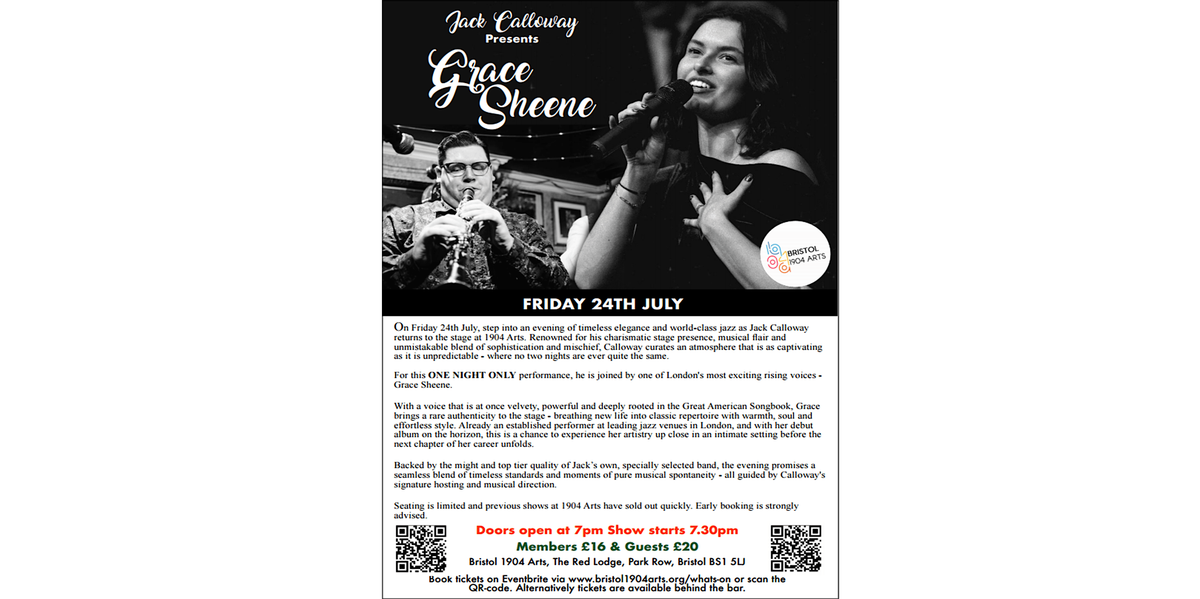 Grace has quickly become an established performer on London’s jazz scene, appearing regularly at venues such as Crazy Coqs, The Ned, Boisdale, and Brown’s Hotel. But for one night only, she will join our Jack Calloway at Bristol 1904 Arts to give us a night not to forget.