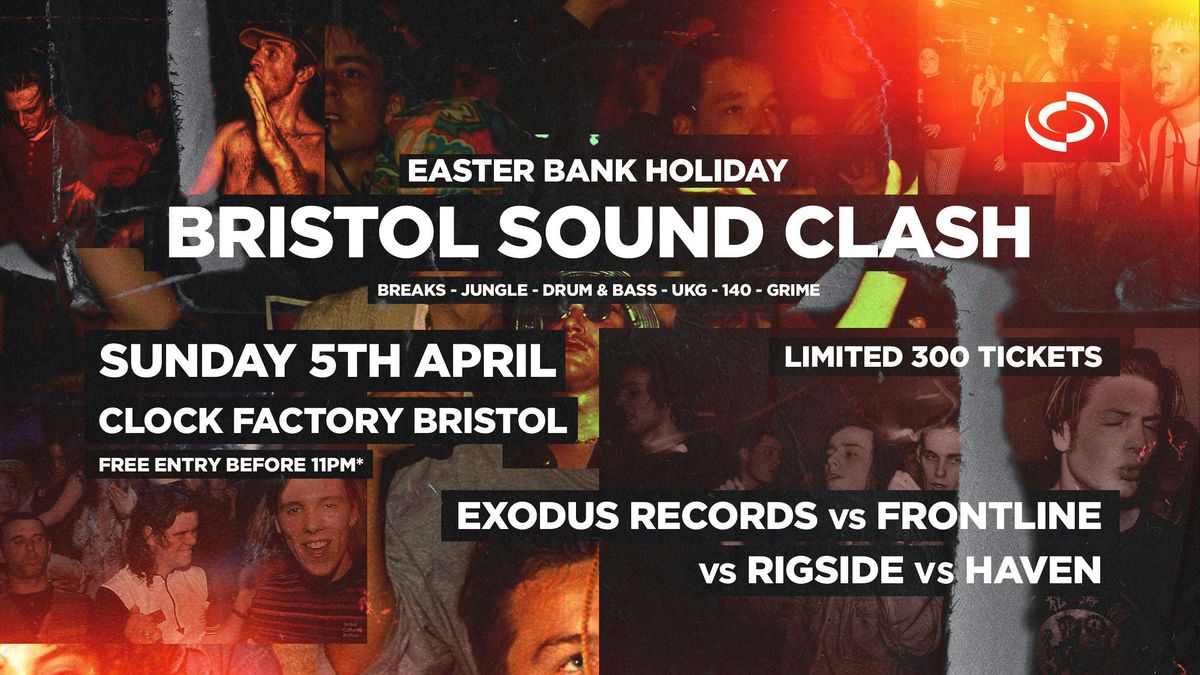We’re taking over Clock Factory this Easter Bank Holiday Sunday in true Bristol fashion as four of the city’s finest brands go head-to-head in the ultimate sound clash!Exodus Records vs Frontline vs Rigside vs Haven!