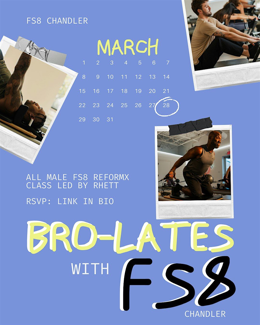 FS8 Chandler is flipping the script and rolling out Bro-Lates on Saturday, March 28 from 2PM–3PM. A 50-minute, male-only sweat session led by instructor Rhett. Strong lead, strong playlist, strong vibes.