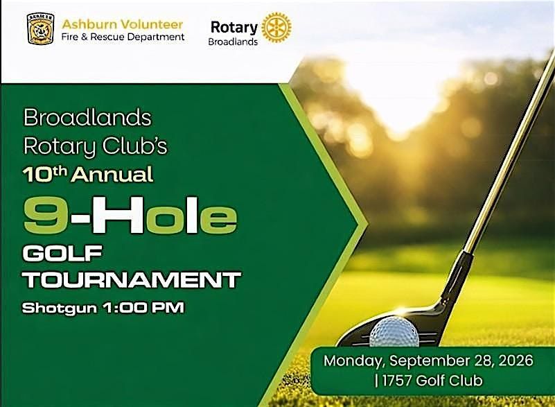 🏌️♂️ Join us for Broadlands Rotary Club's 9th Annual 9-Hole Golf Tournament on Tuesday, September 28, 2026 at 1757 Golf Club, benefiting the Ashburn Volunteer Fire Rescue Department! Swing for a cause and enjoy a day of golf, camaraderie, and community support. Whether you're a seasoned pro or a beginner, all skill levels are welcome. Your participation directly contributes to the invaluable work of the Ashburn Volunteer Fire Rescue Department, ensuring they have the resources they need to keep our community safe. Don't miss out on this opportunity to make a difference while having a blast on the green. Register now to secure your spot and tee off for a great cause! Let's celebrate a decade of giving back together! ⛳️🔥