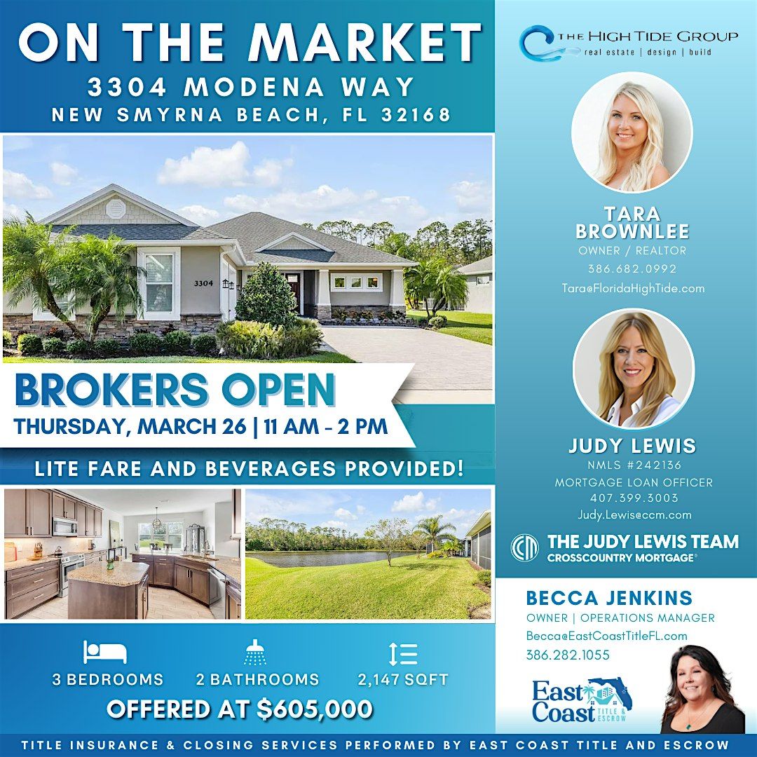 Join us at 3304 Modena Way, New Smyrna Beach, FL 32168 for an exclusive Broker’s Open on Thursday, March 26 from 11 AM – 2 PM.