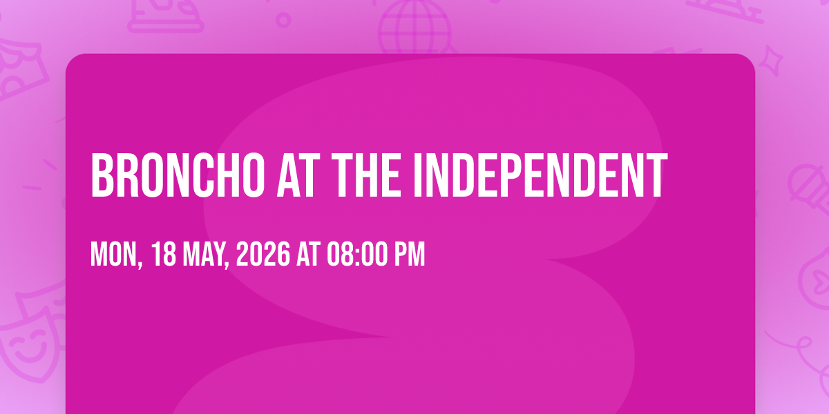 🎉 Prepare to be amazed at Broncho at The Independent, the most anticipated gathering of the season! 🌟 Set against the stunning backdrop of The Independent in vibrant San Francisco, CA, this event promises to redefine your expectations. 📅 Mark your calendars for May 18th, 2026 at 08:00 PM and get ready to immerse yourself in an atmosphere of wonder and excitement. ✨ From the moment you arrive, you'll be transported into a world where memories are made and stories come alive. They have crafted an experience that perfectly harmonizes entertainment, innovation, and community spirit. 🌈 Join us as we create moments that will be discussed for years!