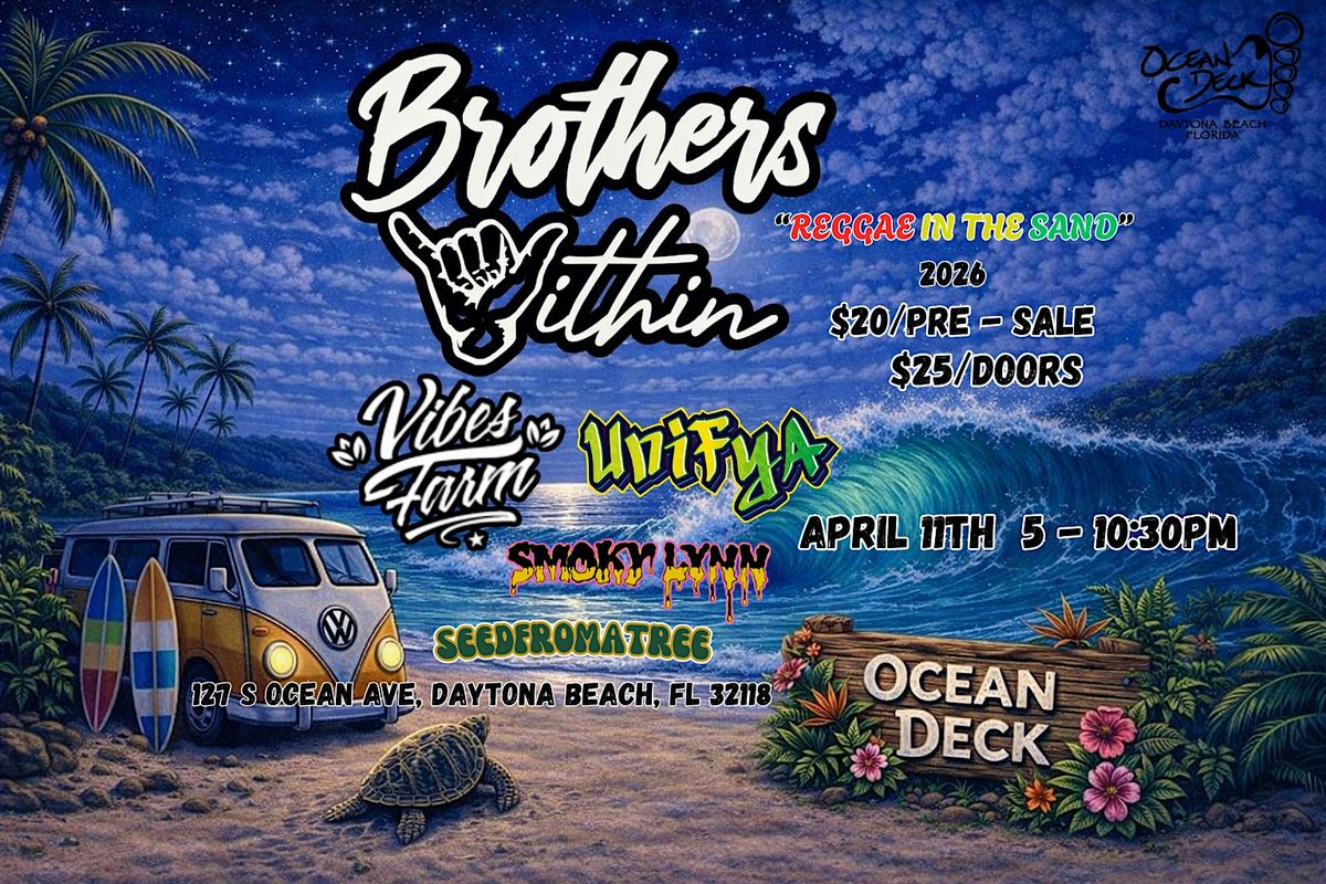 Brothers Within at Ocean Deck in Daytona Beach. Reggae in the Sand 2026 support: Vibes Farm, Unifya, Smoky Lynn & Seed from a Tree.About this Event