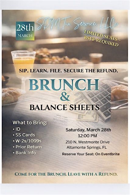 Sip, learn, and file! Join Brunch & Balance Sheets with SDM Tax Service for expert tax help, answers to your questions, and refund confidenc