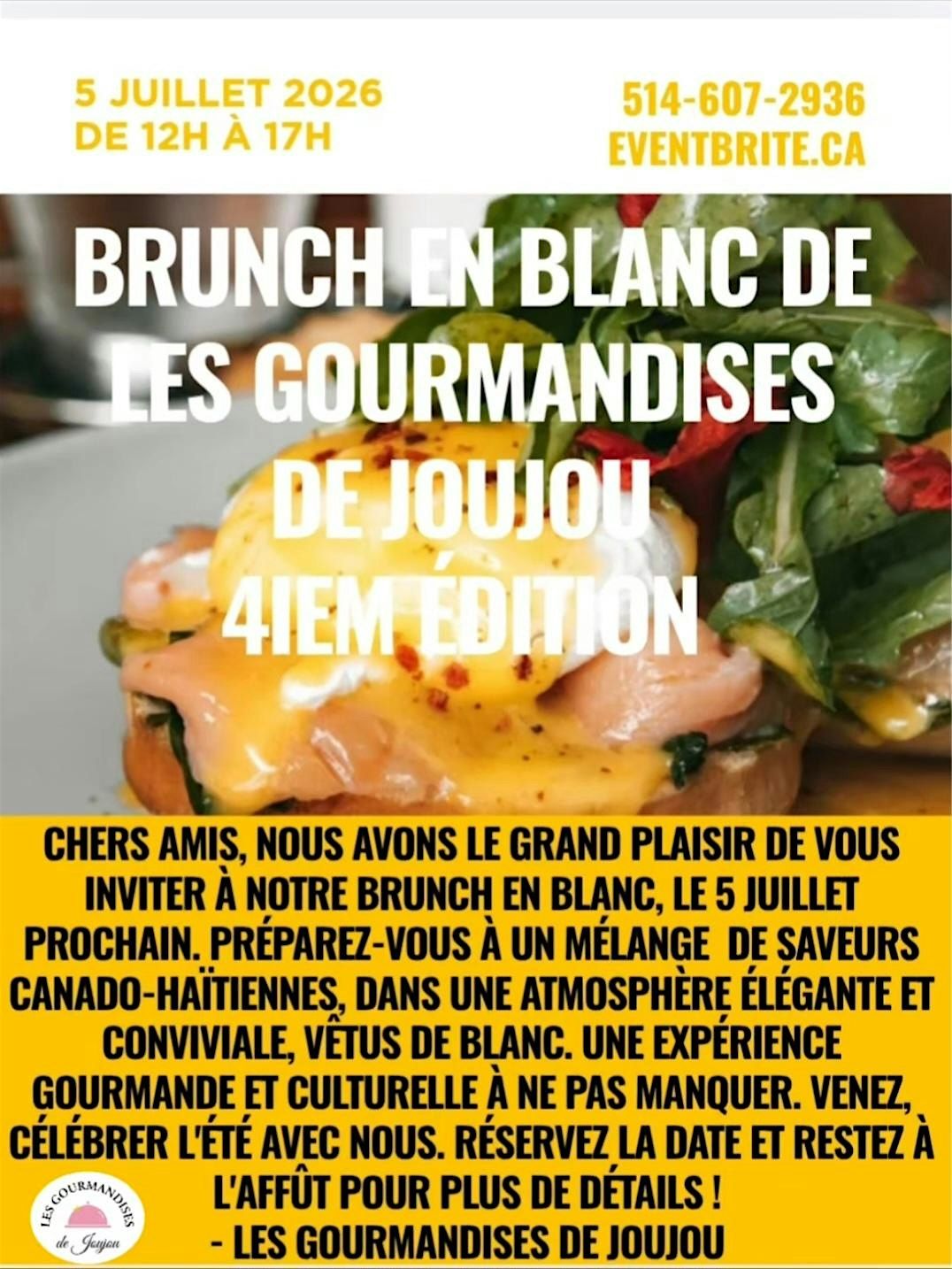 Chers amis, nous avons le grand plaisir de vous inviter à notre brunch en blanc, le 5 juillet prochain. Préparez-vous à un mélange de saveurs canado-haïtiennes, dans une atmosphère élégante et conviviale, vêtus de blanc. Une expérience gourmande et culturelle à ne pas manquer. Venez célébrer l'été avec nous, il va avoir du reseautage, dj, chant, danse, nourriture bien sur et plein de surprises. Prix 65$ Réservez la date et restez à l'affût pour plus de détails !