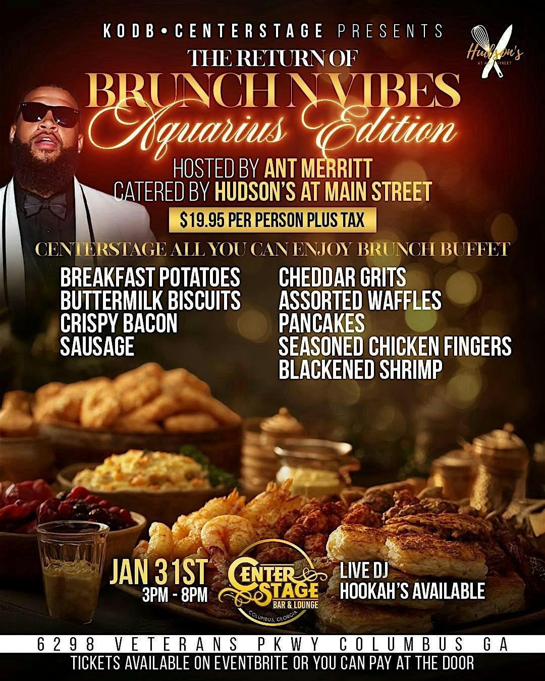#BRUNCHNVIBES IS BACK — AQUARIUS EDITION KODB presents The Return of Brunch N Vibes and we’re celebrating Aquarius season the right way January 31st 3PM – 8PM Centerstage Bar & Lounge6298 Veterans Pkwy, Columbus, GA Hosted by Ant Merritt Catered by Hudson's At Main Street $19.95 per person + tax All-You-Can-Enjoy Buffet Live DJ Hookahs available Tickets on Eventbrite or pay at the door