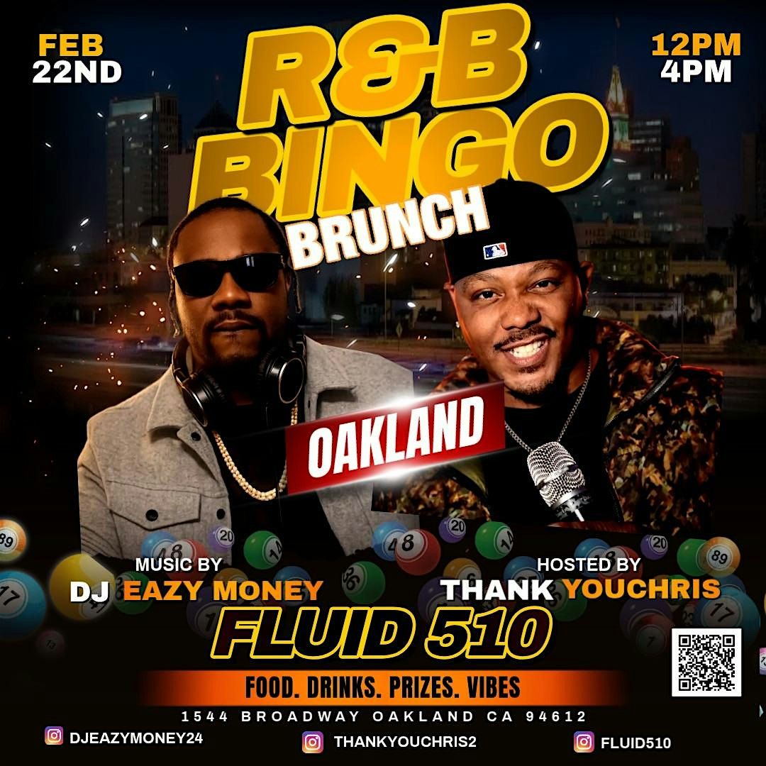 Welcome to R&B BiNGO OAKLAND! Get ready for a night of music, fun, and games at Fluid510. Join us on Sunday APRIL 26TH 2025 at 12pm for R&B Vs Trap Bingo with the one and only THANKYOUCHRIS. It's going to be a night to remember, so bring your friends and get ready to dance, sing, and win some awesome prizes. Don't miss out on this epic event!