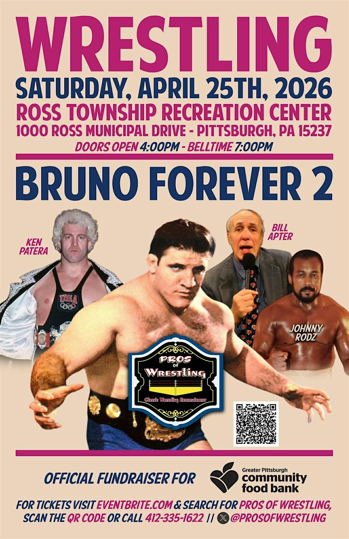 Get ready to join us for BRUNO FOREVER 2! It's the perfect chance to see some of your favorites, support the community, meet fellow fans, and enjoy some unforgettable moments. Don’t miss out on this event - where passion for wrestling and good vibes come together in honor of Pittsburgh's own Bruno Sammartino. Please bring a canned good to donate to the Greater Pittsburgh Community Food Bank! See you there!