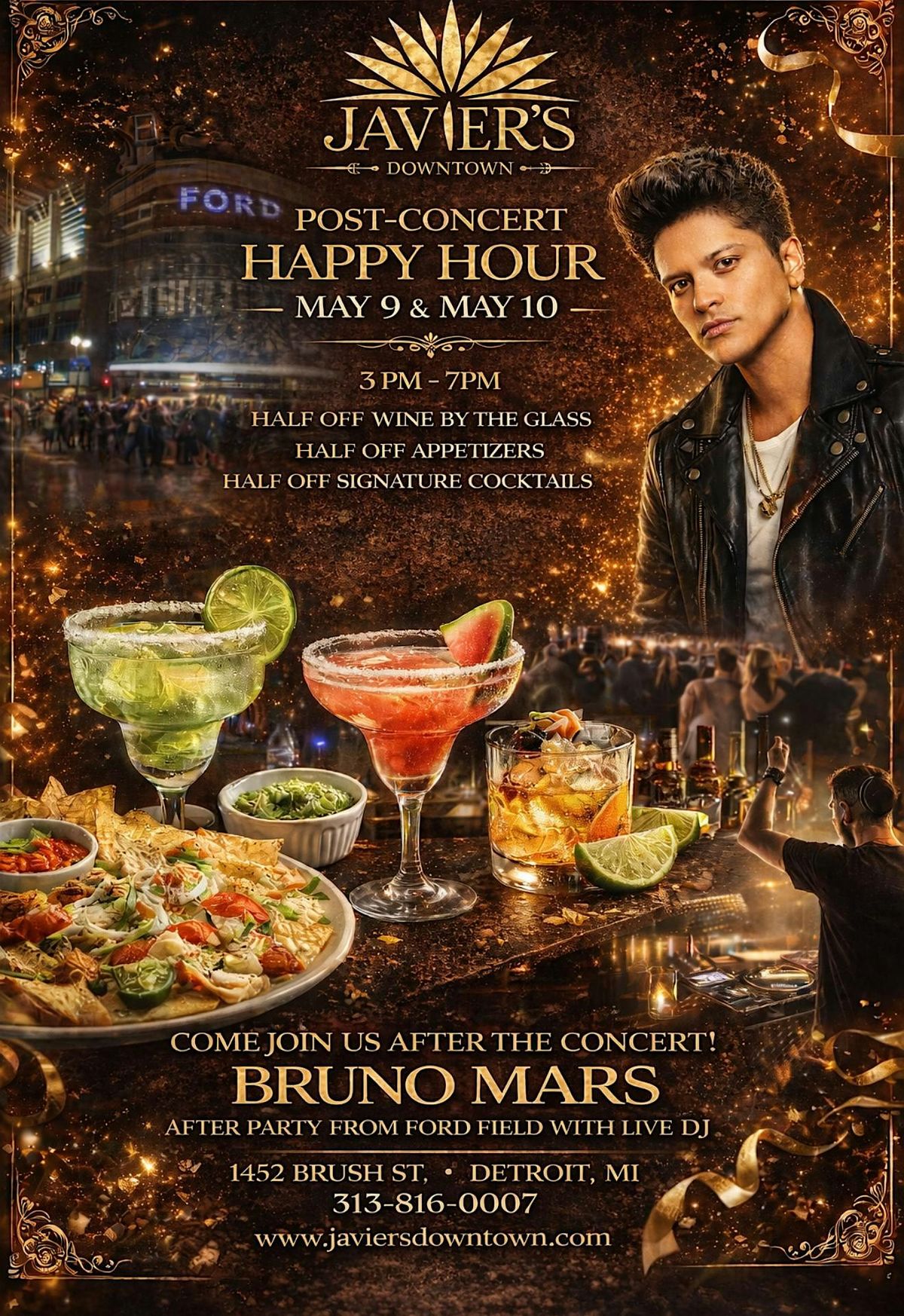 Welcome to the Bruno Mars Post-Concert Happy Hour & After Party at Javier’s Downtown! Join us on March 30, 2026 at 10:00 AM for a night of fun and celebration.