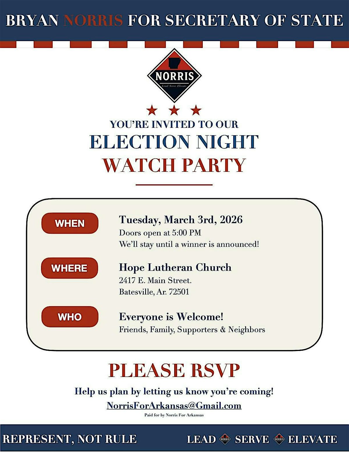 Join the BRYAN NORRIS - ARKANSAS SECRETARY OF STATE Election Night Watch Party!