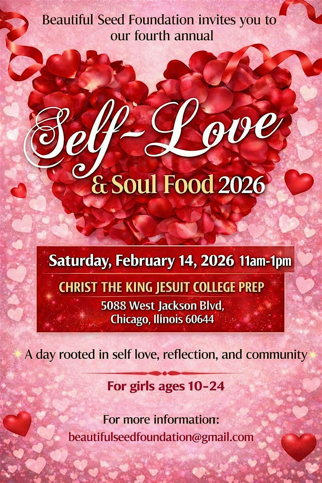 Welcome to BSF's Self-Love & Soul Food 2026 event! Join us at Christ the King High School in Chicago, IL, USA for a day filled with self-care, empowerment, and delicious soul food. Let's come together to celebrate and nourish our minds, bodies, and souls. Get ready for inspiring speakers, uplifting activities, and of course, amazing food that feeds both the body and the soul. Don't miss out on this opportunity to connect with like-minded individuals and treat yourself to a day of self-love and positivity. See you there!