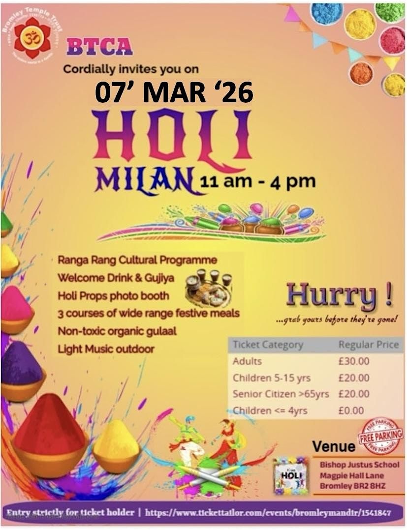 For more details please visit. https://www.tickettailor.com/events/bromleymandir/2009751
