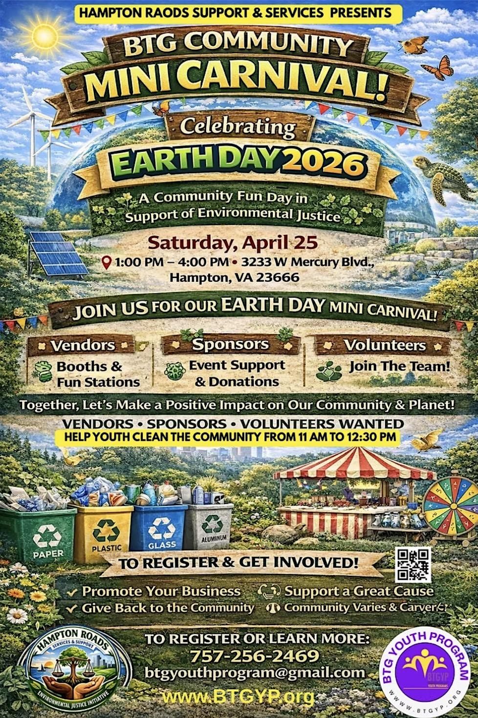 Hosted by Hampton Roads Services & Support and the BTG Youth Program, this exciting Earth Day celebration is more than just an event—it’s a community activation platform designed to connect families, businesses, and organizations while supporting environmental justice.