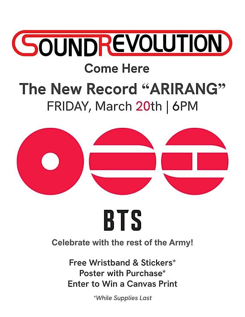 Join us for a fun and chill listening party to vibe with BTS's latest tracks from ARIRANG. We'll be hanging out in person at 8312 Louetta Rd suite b. Mark your calendar for March 20, 2026 at 6:00 PM (Central Time) and get ready for some great music and good company!