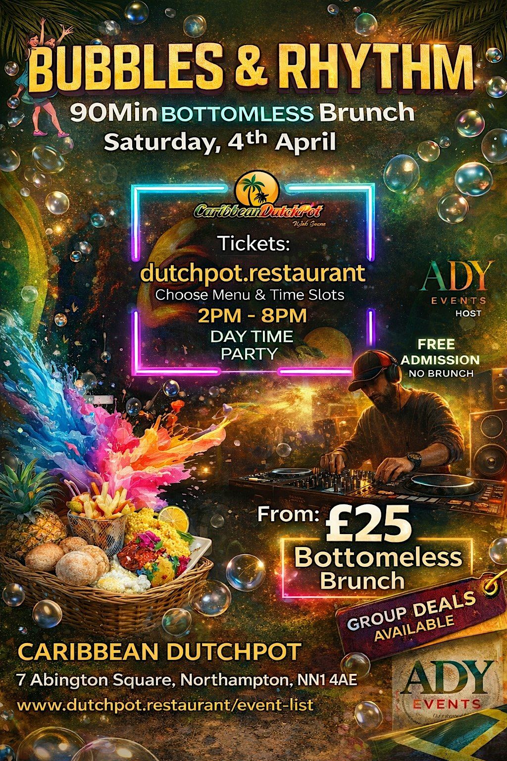 Join us for a fun day at Caribbean DutchPot on April 14, 2026 at 1pm! Get ready to enjoy great vibes, awesome rhythms, and plenty of bubbles to keep the good times flowing. Whether you're coming with friends or flying solo, this event is all about chill beats and good company. Don’t miss out on a lively atmosphere and tasty treats in a cool spot. See you there!