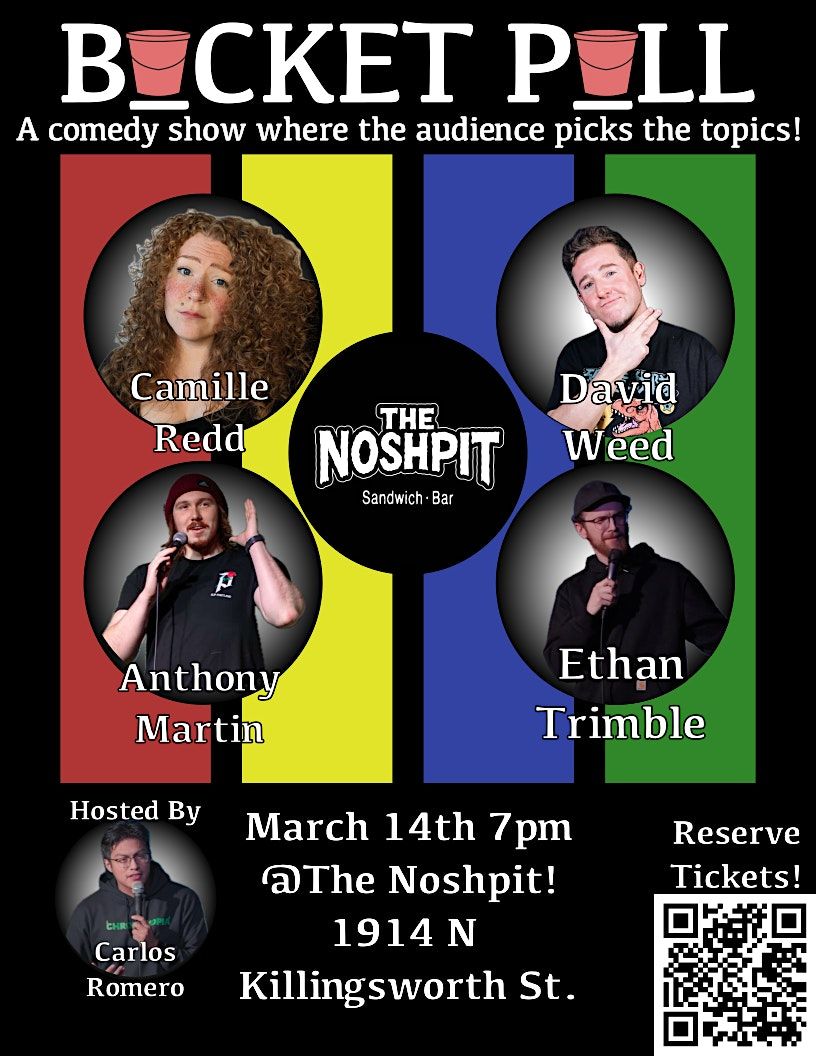 Tired of comedians talk about their private parts? Or think they dont talk about them enough? Well now you have the control of what they talk about! Bucket Pull is a brand new show for those who dont want the attention of being called out but can write down a prompt anonymously and hope the comedian pulls their suggestion out of a bucket! Audiences control what topics are talked about while the finest comedians come up with jokes on the spot!