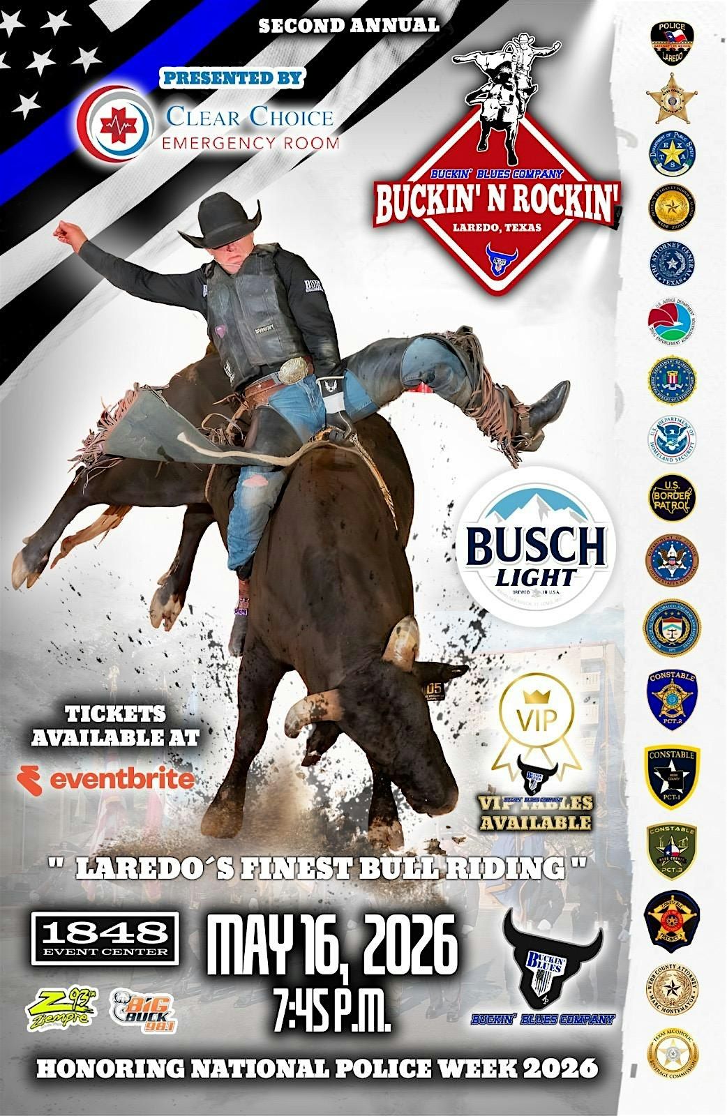 Buckin’ Blues Company brings back the 2nd Annual Buckin’ N Rockin’ Invitational Bull Riding, honoring National Police Week 2026.About this Event
