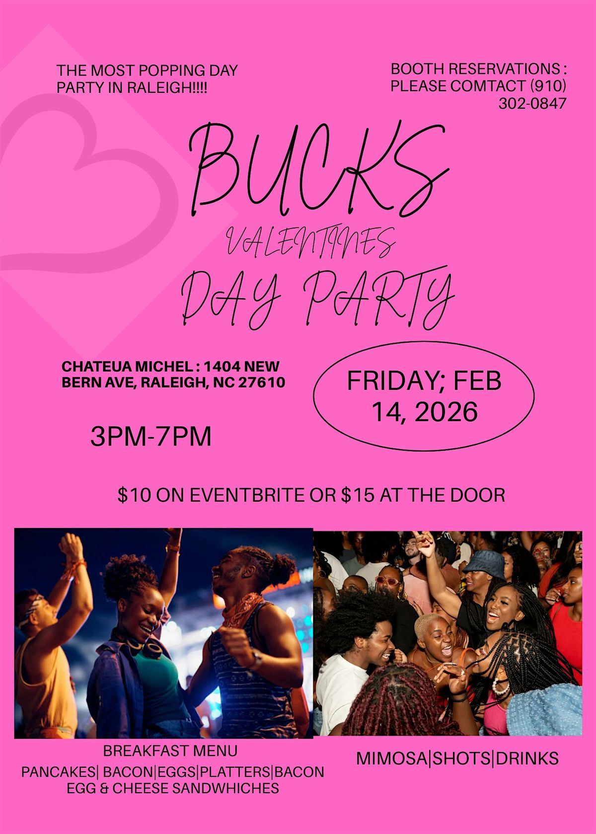 Welcome to Bucks Valentines Brunch & Day Party at Chatueu Michel! Join us on February 14, 2026 at 3:00 PM for a day filled with love and fun. Get ready to enjoy delicious brunch options, refreshing drinks, and great music.