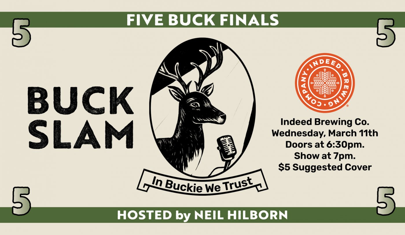 BuckSlam is the Twin Cities' only monthly poetry slam, and this March, we're leaving it all on the stag(e) at our 2026 FIVE BUCK FINALS hosted by the one and only Neil Hilborn!!! Our top poets from the past season will compete for bragging rights, cash prizes, and a chance to be part of this year's BuckSlam Poetry Team! Come on out to Indeed Brewing Company on Wed. March 11th at 6:30pm to celebrate, support, and cheer on these amazing artists and performers. You are guaranteed to leave with your h(e)art moved and your spirit full. Herd that!