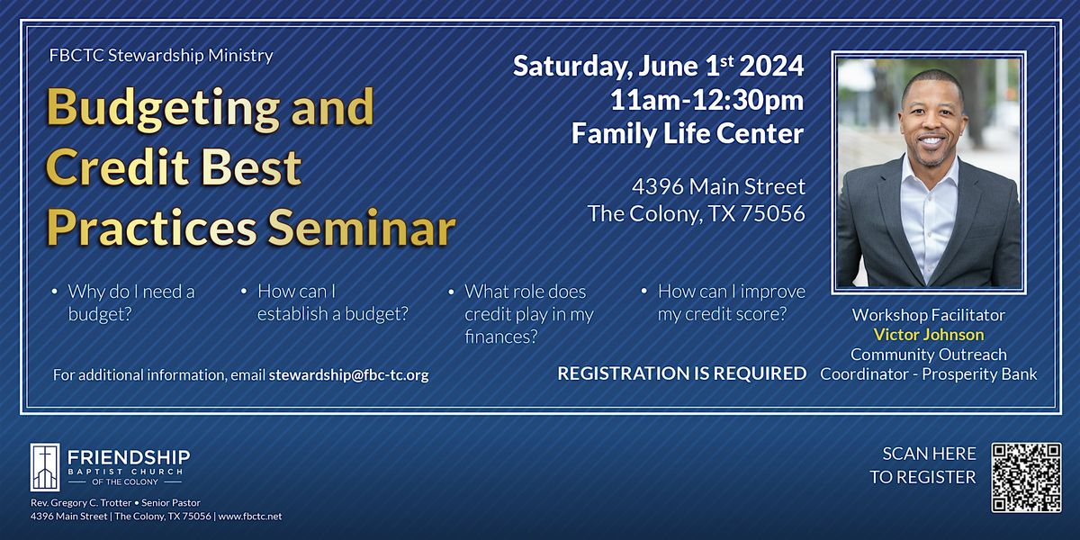 Welcome to the Budgeting and Credit Best Practices Seminar! Join us on Saturday, June 1st, 2024 at 11:00 AM at Friendship Baptist Church of The Colony for an informative session on managing your finances. Learn best practices for creating a budget and improving your credit score. This in-person event will provide valuable tips to help you achieve financial success. Don't miss out on this opportunity to take control of your finances and secure your future. See you there! Registration is required.