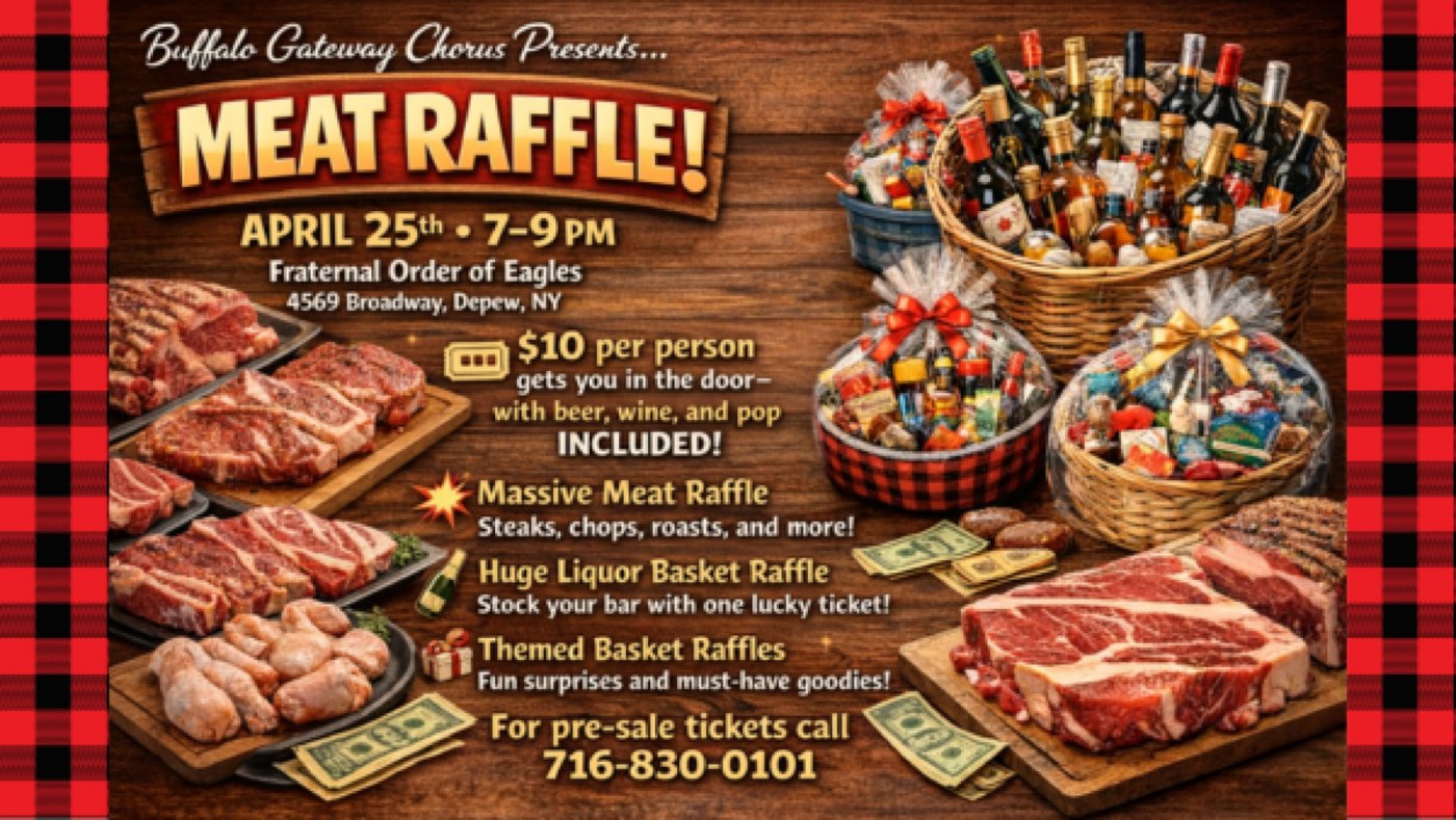Come have a sizzlinโ good time with the Buffalo Gateway Chorus at our Meat Raffle.