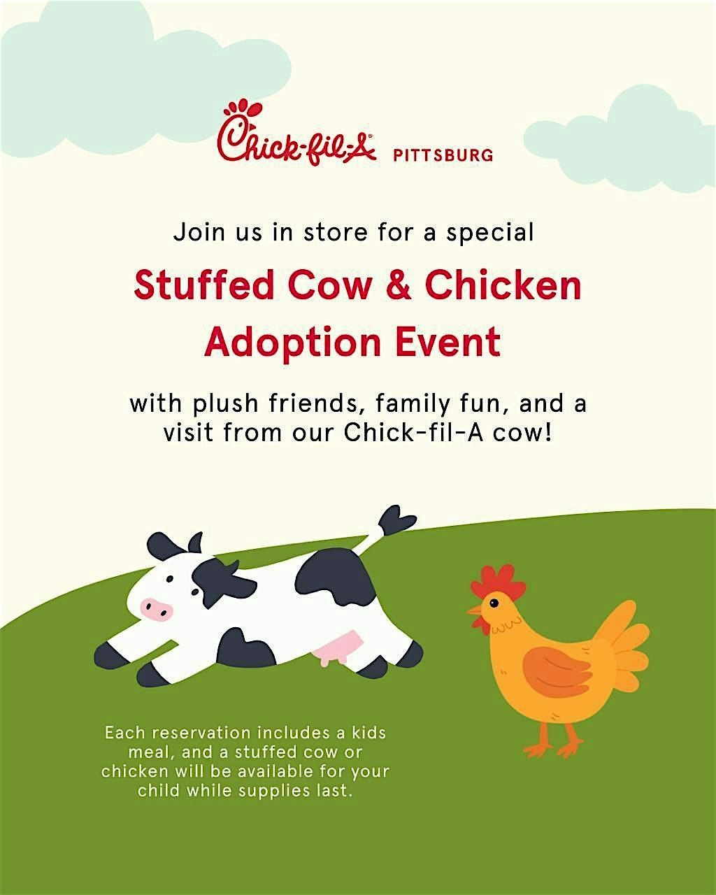Join us at Chick-fil-A Pittsburg for a joyful Stuffed Cow & Chicken Adoption Event made to create smiles and special family memories. Kids will get to meet the Chick-fil-A Cow, choose their own plush friend, and enjoy a fun experience together with family and friends. Each reservation includes a kids meal, and a stuffed cow or chicken will be available for your child while supplies last. We can’t wait to celebrate with our community and make this a day your family will remember.