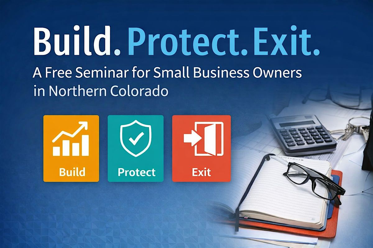 Join us for Build. Protect. Exit., a practical seminar for small business owners in Northern Colorado who want to think more strategically about the future of their business and personal wealth. This session brings together expertise in business value growth, estate and legal protection, and integrated financial planning so you can see the full picture more clearly.