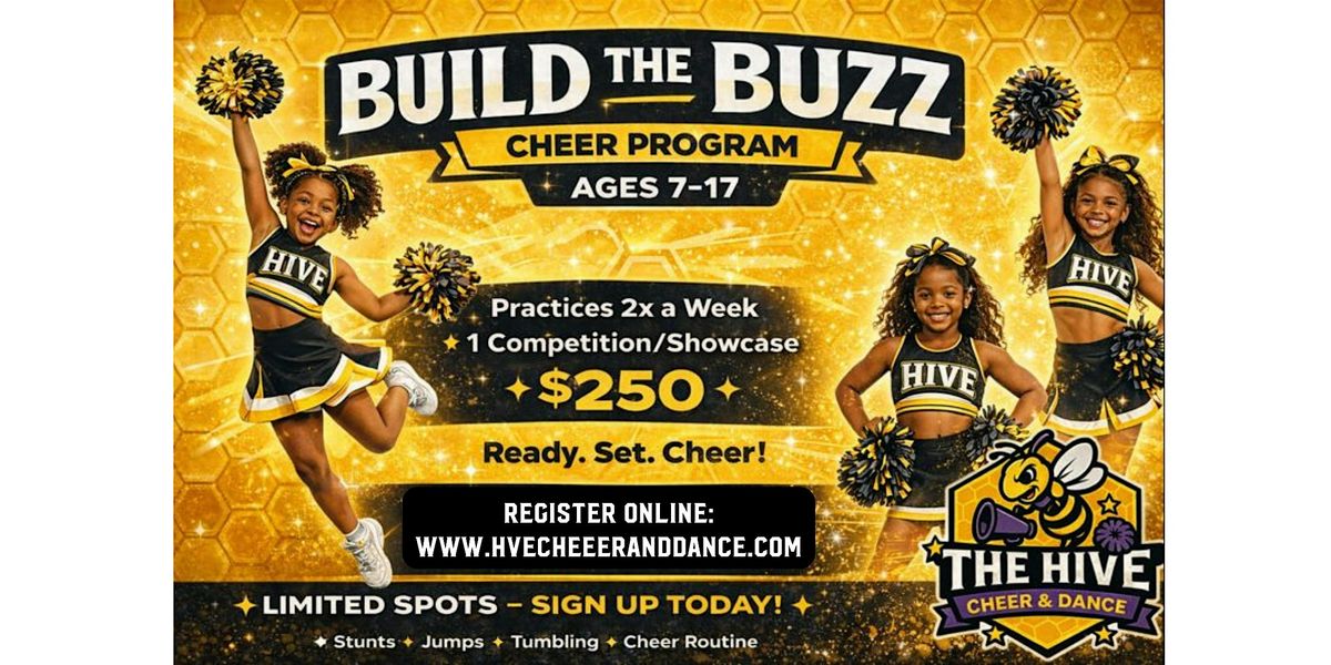 Ready to introduce your athlete to the exciting world of cheer? Build the Buzz is a fun, energetic, and beginner-friendly cheer program designed to build confidence, skills, and teamwork—all while having a blast!