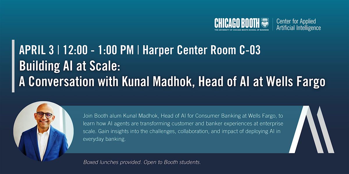 Discover what it takes to build and deploy AI across a leading financial institution with Booth alum Kunal Madhok, Head of Artificial Intelligence for Consumer Banking and Lending at Wells Fargo. Kunal will share how Wells Fargo is implementing AI agents to support customers and bankers, with real examples of these tools in practice. Gain insights into the process, collaboration, and challenges of bringing AI into everyday banking at enterprise scale, and learn what this means for the future of financial services.