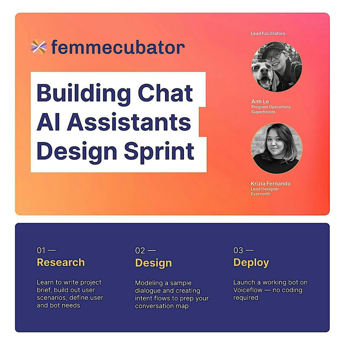 Join us for an in-person workshop and intro session on Conversational AI Design hosted by Femmecubator and Superbloom Design.