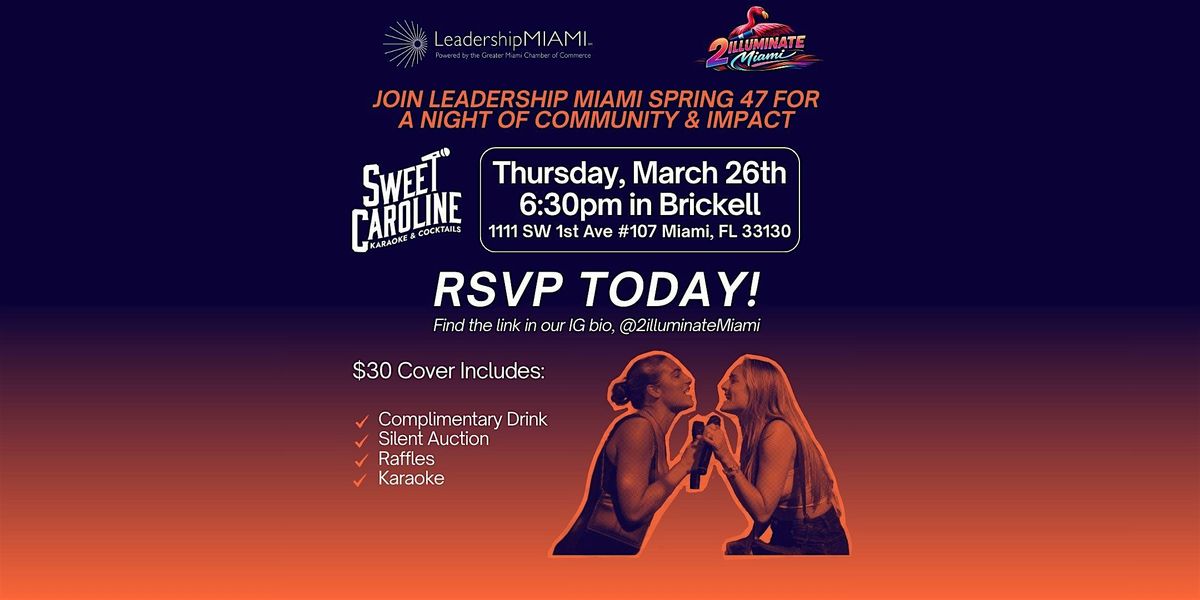 Join Leadership Miami Team 2Illuminate Miami for an evening of connection, community impact, and high-energy fun at Sweet Caroline Karaoke & Cocktails in Brickell.