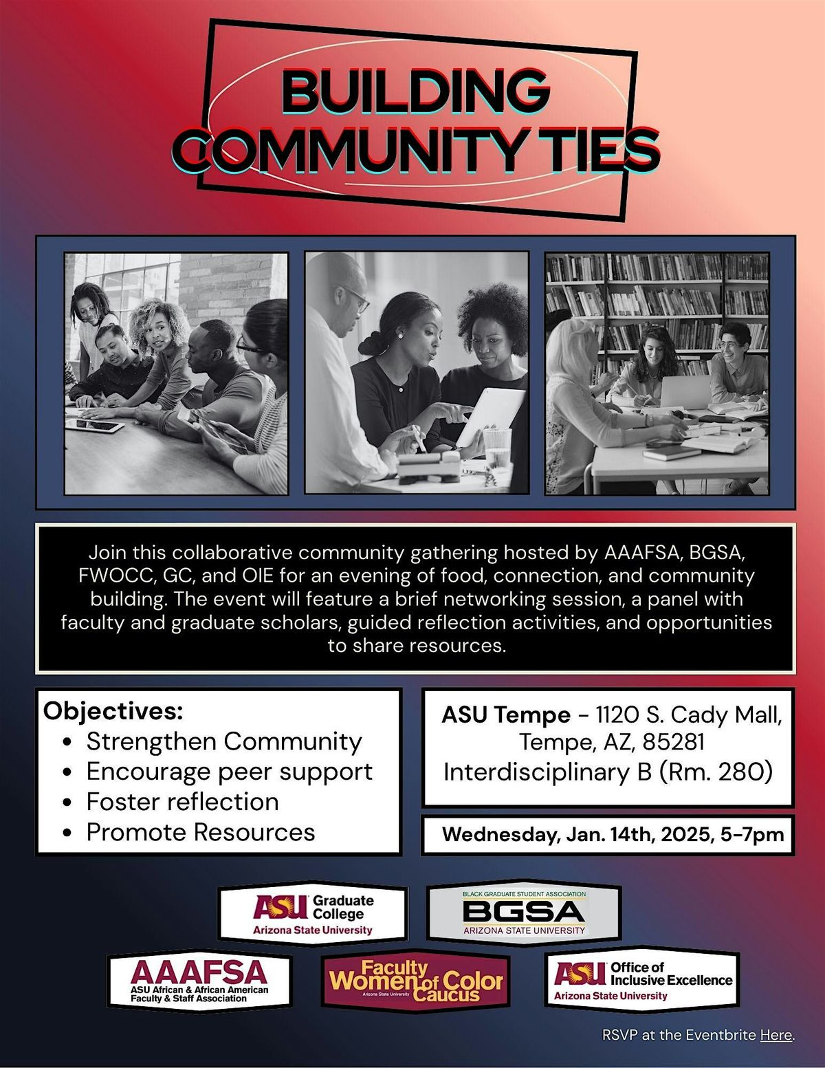Building Communitas is essential for the new year, new semester! This collaborative gathering is for faculty, staff, graduate scholars and friends. We'll break bread together, engage in a panel discussion with both faculty and grad scholars, reflect together through collaborative activities and share resources.
