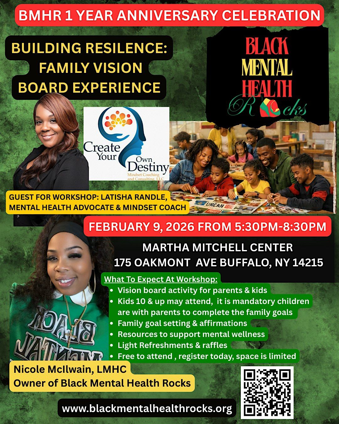 Black Mental Health Rocks invites you to join us for our one year anniversary. We are celebrating byhaving food, raffle and particpating in a family orienated activity. We decided to host a family vision board experience with our guest workshop faciltaior Latisha Randle, Mental health Advocate and Mindset Coach and the owner of Create Your Own Destiny Mindeset Coaching and Consulting, LLC. She would lead us in this activity where families work together to create one shard vision amongst themselves.