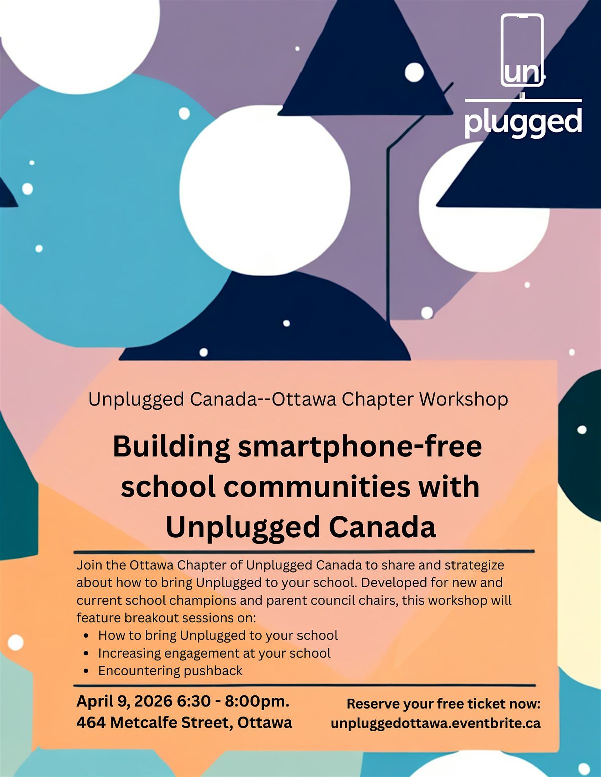 Join the Ottawa Chapter of Unplugged Canada as we share and strategize together about how to bring Unplugged to your school. This evening is aimed at new and current school champions, parent council chairs, and anyone who is keen to highlight this issue at their kids' school. We'll break into groups to strategize about: