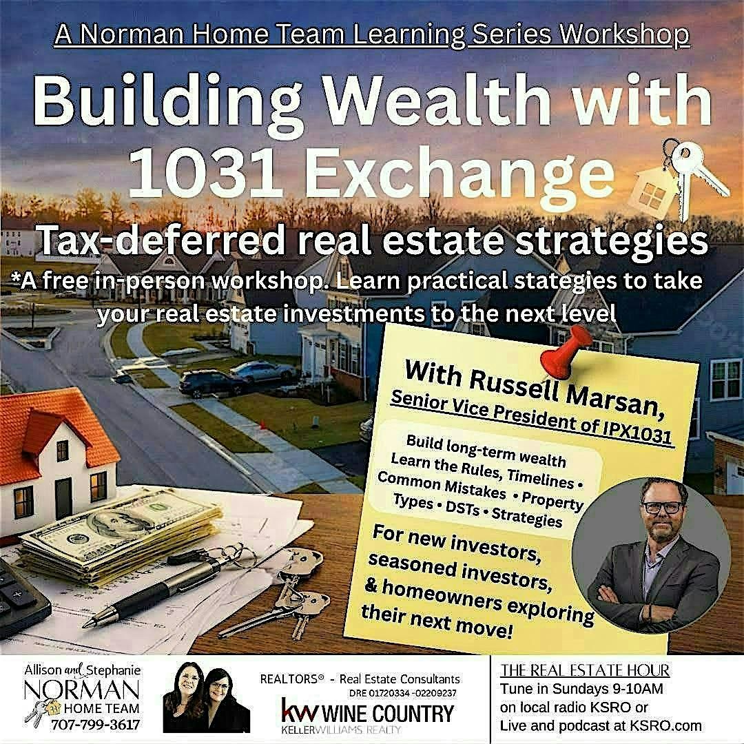 A Norman Home Team Learning Series Workshop. Join us for an engaging in-person event with Russell Marsan Senior Vice President of IPX1031. You'll learn how to grow your wealth using 1031 Exchange tactics! Discover clever ways to defer taxes while investing in real estate and make your money work smarter, not harder. Whether you're a new or a seasoned investor, or just curious, this workshop is packed with practical tips and strategies to boost your portfolio. Don't miss out on this chance to take your real estate game to the next level!