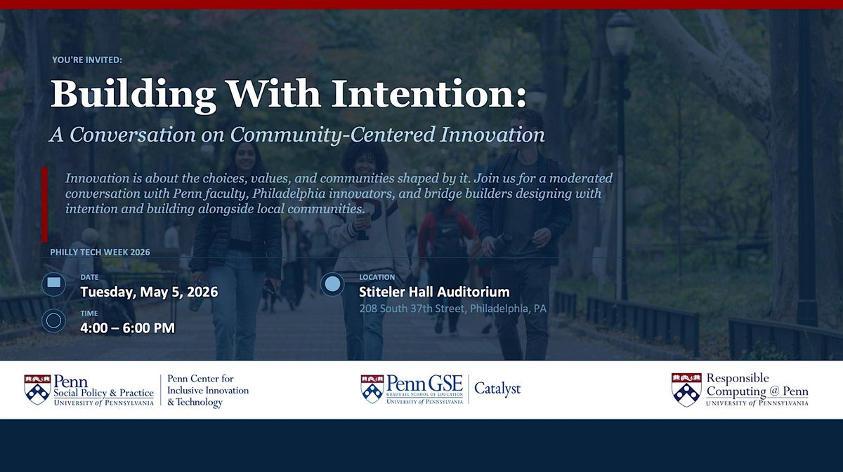 Join us for Building With Intention: A Conversation on Community-Centered Innovation. This moderated conversation brings together Penn faculty, Philadelphia innovators, and bridge builders to examine how the choices embedded in innovation shape communities and collective well-being. This conversation is part of Philly Tech Week 2026.