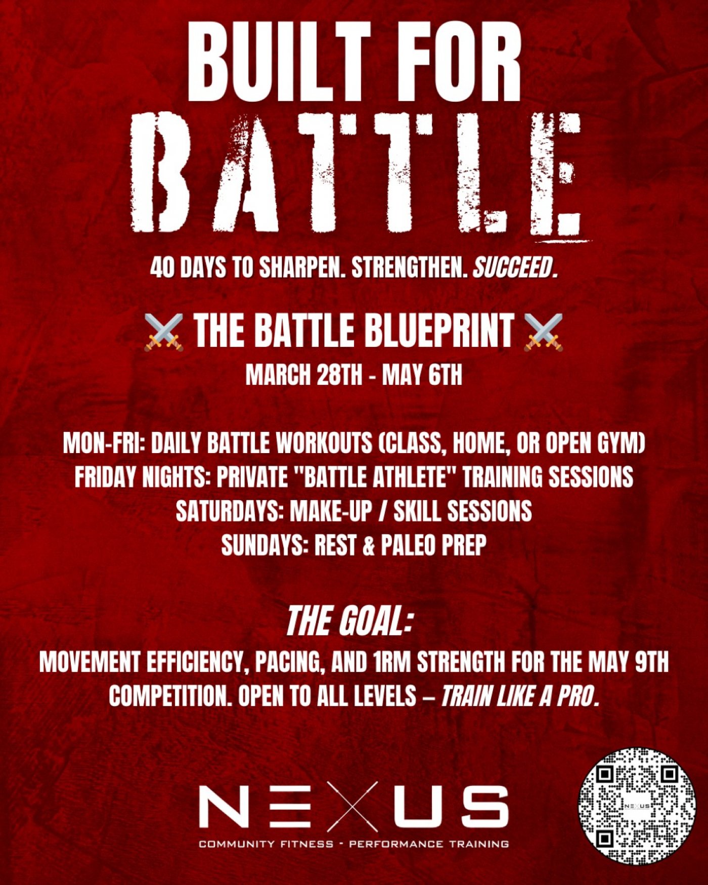 Built for Battle is a 40-day, strength & conditioning-style training program designed to sharpen your strength, build your energy, and prepare your body and mind for the NEXUS Community Competition. đź’Ş You do not have to compete in the NEXUS Community Competition to participate in our Built for Battle training program... but you’ll definitely be prepared to!Â