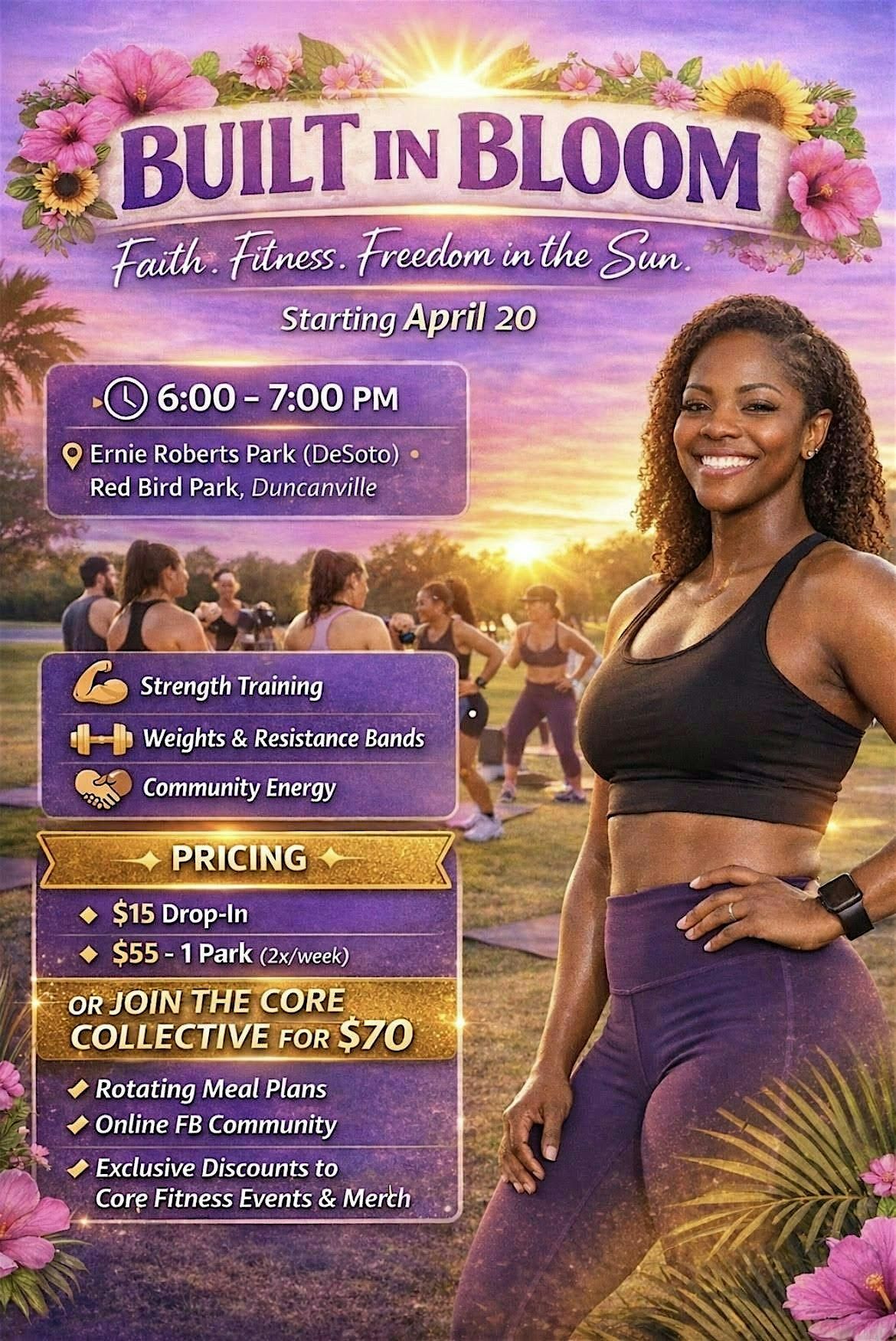 Joining Thee Core Collective is for the women ready to go all in. Recieve acess to bootcamps at both parks for 4 workouts per week and maximum results. Rotating meal plans, online FB community, Priotity Access to Events, Special Merch Pricing, and Memeber-only challenges and giveaways!
