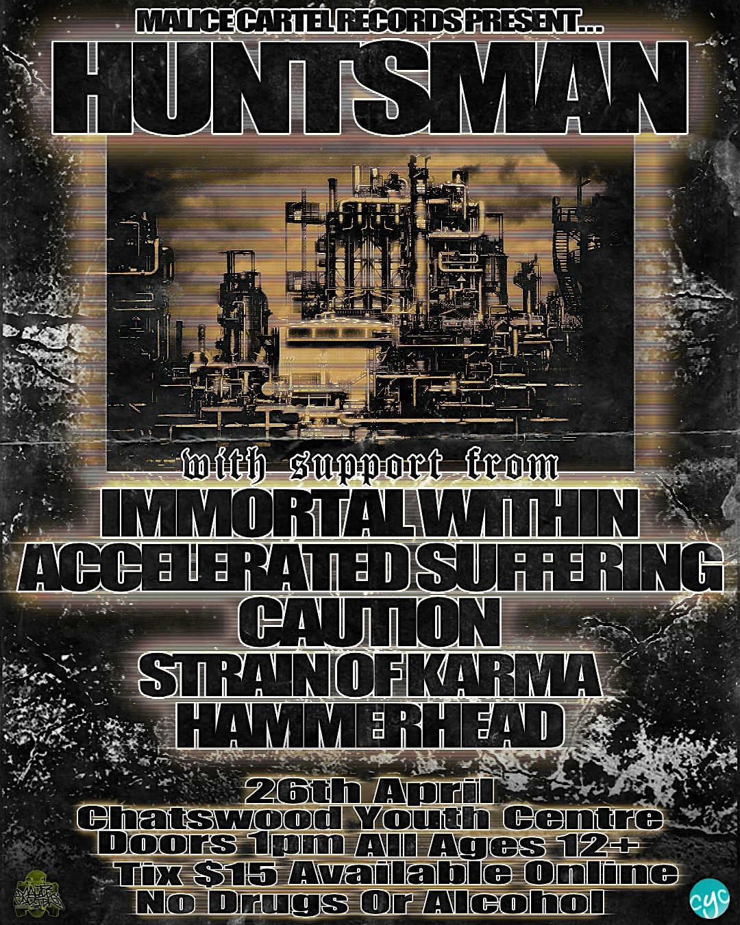 Malice Cartel Records brings another stacked Sydney hardcore lineup to the Chatswood Youth Centre. Headlined by Huntsman, with support from Accelerated Suffering, Caution, Strain of Karma, HammerHead and Served, this show brings together some of the most intense bands coming up in the local scene.