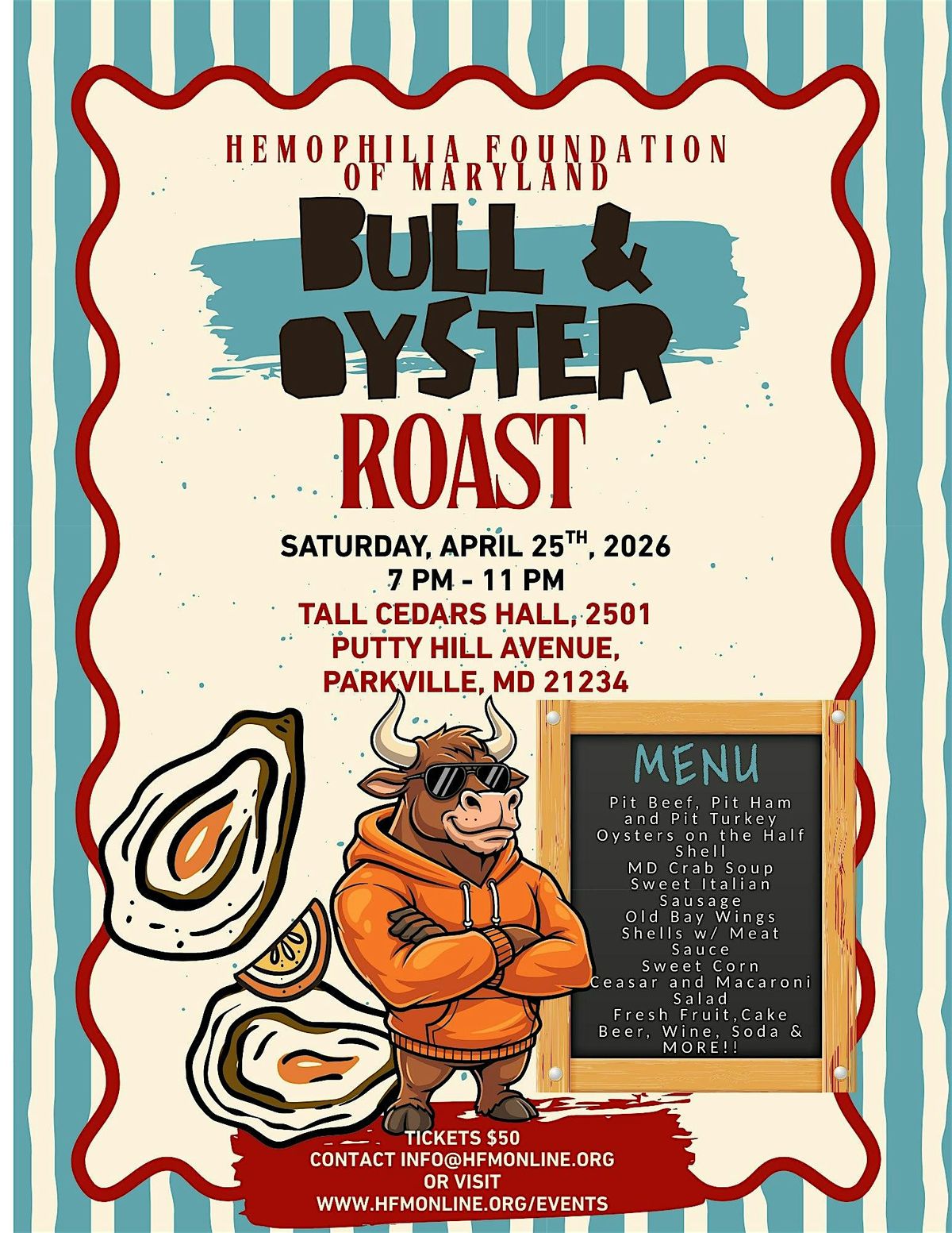 Join us for a fun-filled night supporting the Hemophilia Foundation of Maryland! Enjoy pit beef, ham & turkey, oysters on the half shell, MD crab soup, wings, desserts, drinks, and more. 🦪🥩🍻