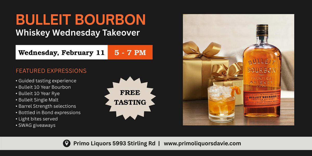 Join us for an elevated Bulleit Bourbon Whiskey Wednesday Takeover featuring a guided tasting experience, premium aged expressions, light bites, and exclusive swagāall hosted in-store at Primo Liquors.