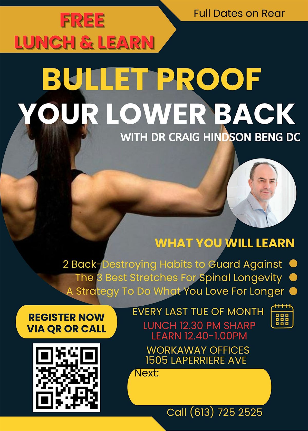 My name is Dr Craig Hindson BEng DC of Loving Life Chiropractic in Westboro Ottawa and since returning from my 3rd war zone in 2003, I have been helping people from all walks of life, move better, think better, eat better, and rest better ... and this is your "Bullet Proof Your Lower Back" Free Lunch and Learn :)