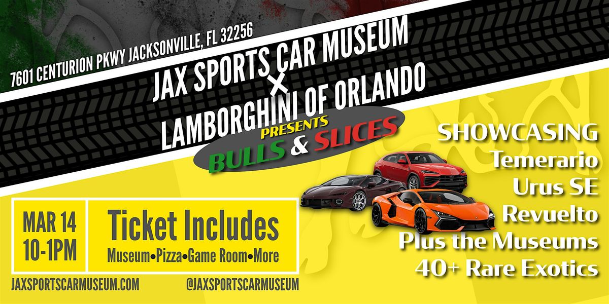 Join us on Saturday, March 14th from 10 AM to 1 PM for Bulls & Slices at the Jax Sports Car Museum, featuring Lamborghini of Orlando.