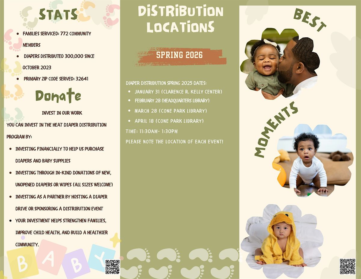 Join us for the Bundle of Joy Diaper Distribution Program at the Headquarters Library, Cone Park Library, and Clarence R. Kelly Center in Gainesville, FL, USA! We are excited to offer this in-person event where parents and caregivers can receive free diapers for their little ones. Our goal is to support families in need and provide them with essential resources. Come visit us at our location on East University Avenue and take advantage of this wonderful opportunity. Don't miss out on this chance to get diapers for your bundle of joy! This event is sponsored by Humana, Inc.