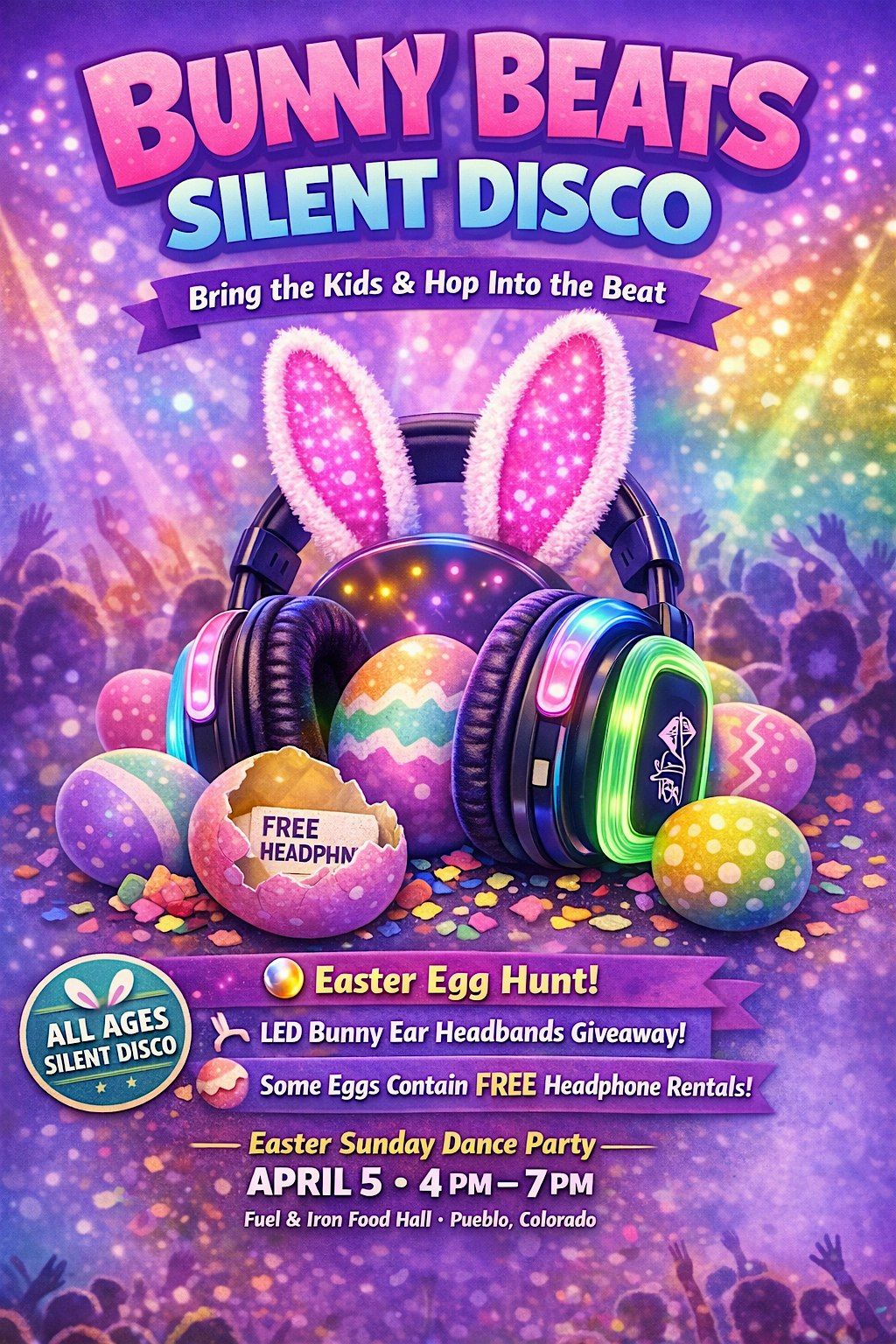 Bunny Beats Silent Disco – Family-friendly Easter dance party at Fuel & Iron! DJs, wireless headphones, bunny ears & an Easter egg hunt.